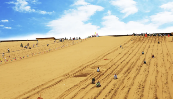 乘坐滑板从高高的沙山顶自然下滑,下滑时随着沙山的坡度加大和下滑速度的加快,顿觉两耳生风,转眼之间就冲到了山下,在“有惊无险“的瞬间体验刺激与快感。
