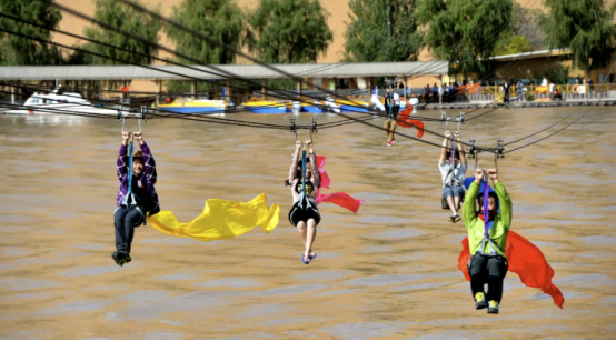 飞越黄河的过程中,低头就能看到脚下的黄河水与岸边的沙漠,将沙坡头的美景尽收眼底。