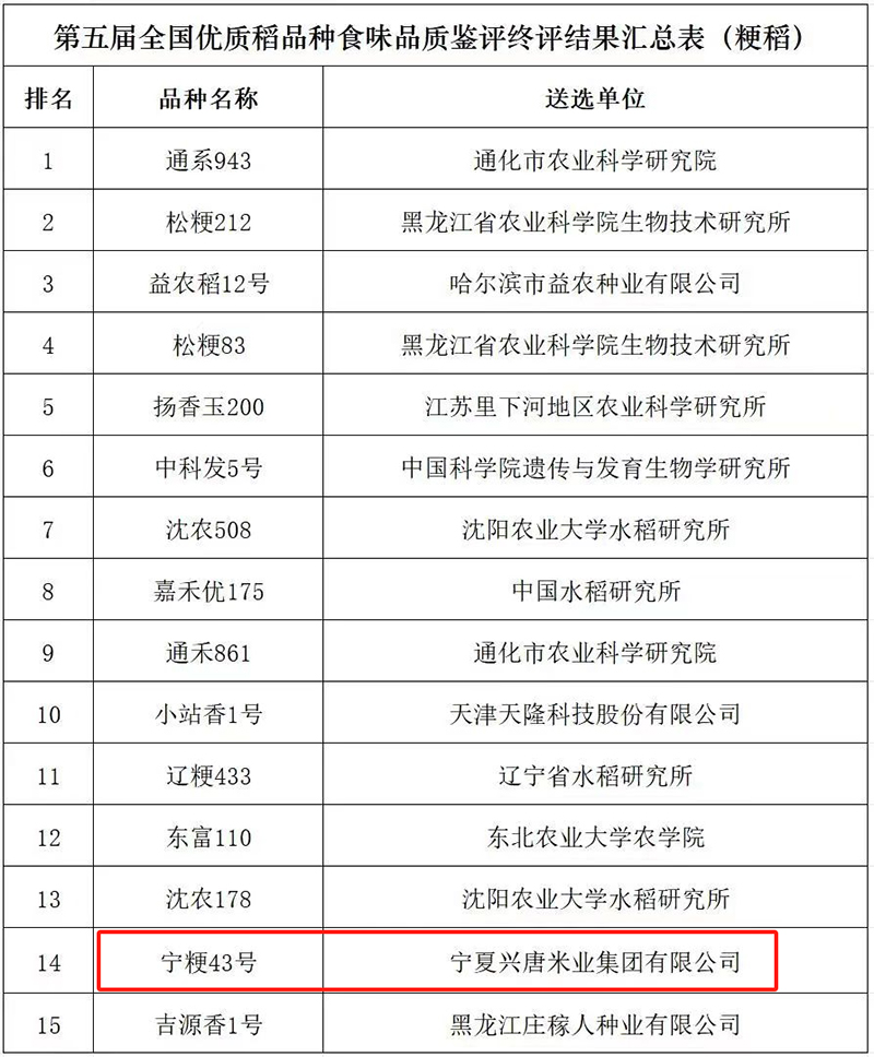 经过专家组严格评选和专业品鉴,15个粳稻品种和15个籼稻品种获评金奖。其中,由宁夏兴唐米业集团有限公司选送的宁粳43号榜上有名。此次获评金奖的品种,代表了全国优质稻品种的最高水平,展现了国家水稻育种联合攻关的优秀成果。