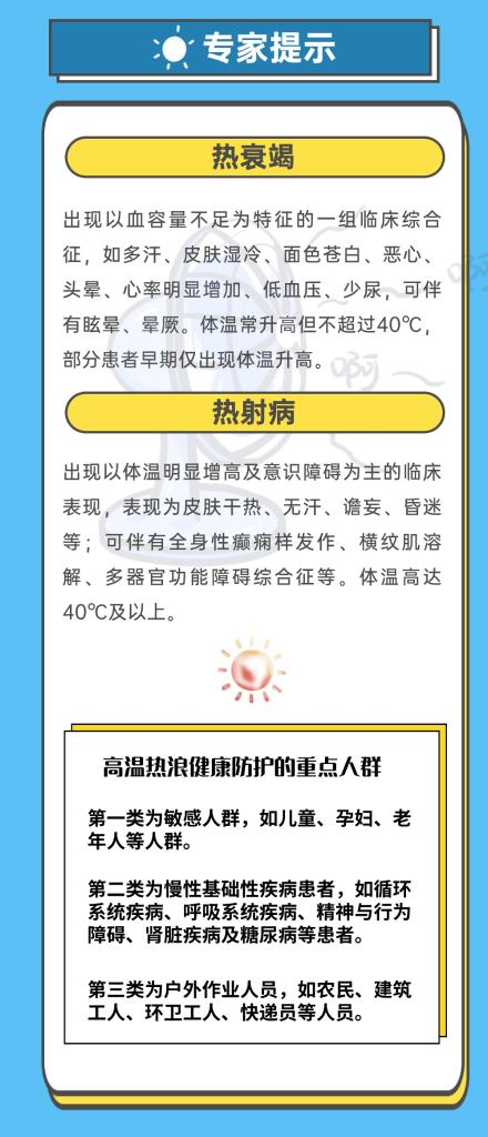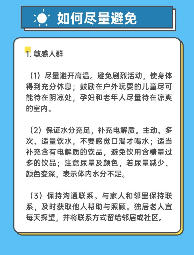 连日来,北方高温天气持续发展,多地气象部门发布高温预警。未来几天,我国不少地区将开启连续高温模式,部分地区气温将冲击40℃。高温来袭,如何防范中暑、热射病?这份《高温热浪公众健康防护指南》请收好。