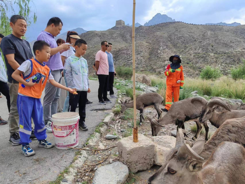 “老黑,下来吃粮了!”在银巴古驿研学点,随着岩羊司令的一声呼唤,近百只岩羊从各个山头跳跃着走向人群,学生们近距离观察岩羊、与岩羊合影互动,深入了解贺兰山自然生态保护成果。
