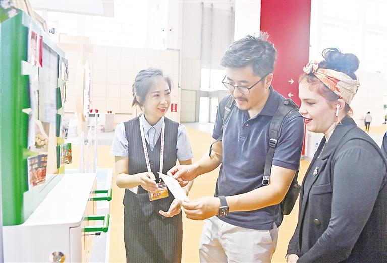 在有声明信片打印机旁,从博物馆“借”来的绿色邮筒等场景设置,吸引了不少观众拍照打卡。“在打卡墙前拍照,将照片做成有声明信片,盖上具有宁夏特色的印章,再将明信片与宁夏葡萄酒一起寄给亲朋好友,很有纪念意义。”一位来自深圳的参展商说。