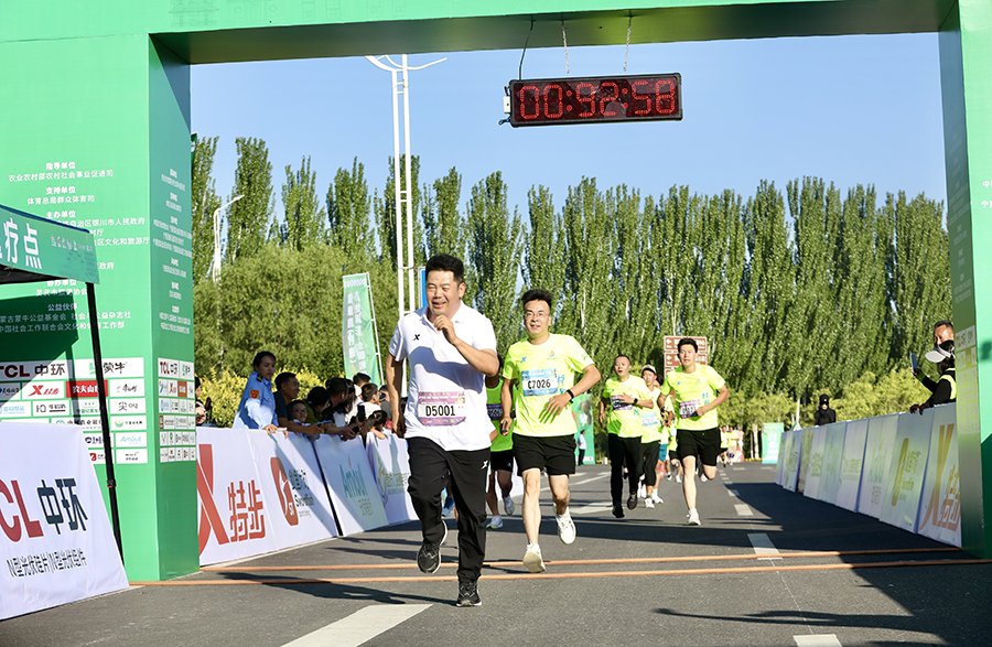 赛道沿途,农田阡陌纵横,稻浪瓜果飘香,农民质朴热情,笑意盈盈。参赛选手们激情四射,在畅跑中沉浸式领略塞上江南的田园之美、感受灵武发展的蓬勃之势、感悟千年古县的人文之韵。各补给点还增添“动我柿柿”小番茄、牛奶等灵武特色产品,为跑者补足能量。