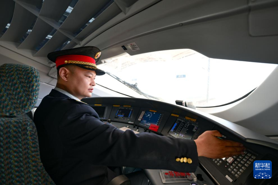 10月1日,由银川开往惠农的C8218次列车上,动车组司机在进行发车前的准备工作。