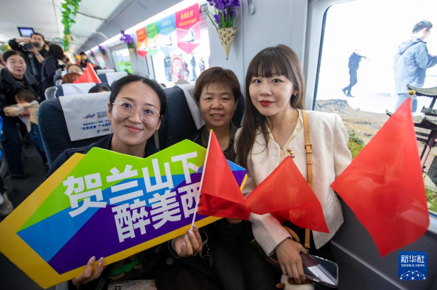 10月1日,在由银川开往惠农的C8218次首发列车上,艺术家演唱当地特色歌曲《花儿》。