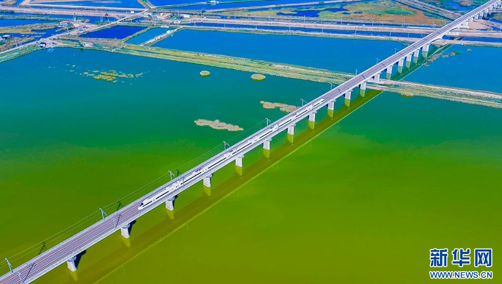 10月10日,一列动车组列车行驶在镇朔湖特大桥上(无人机视频截图)。新华网发 栾丰年 摄