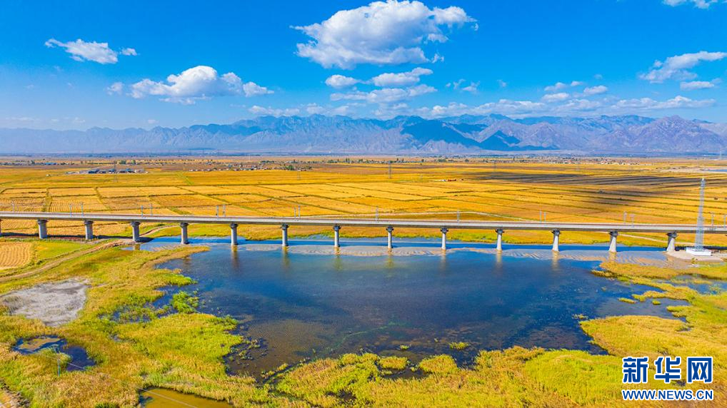 金秋十月,包银高铁惠银段与贺兰山、金色稻田同框(10月9日摄,无人机照片)。新华网发 马智超 摄