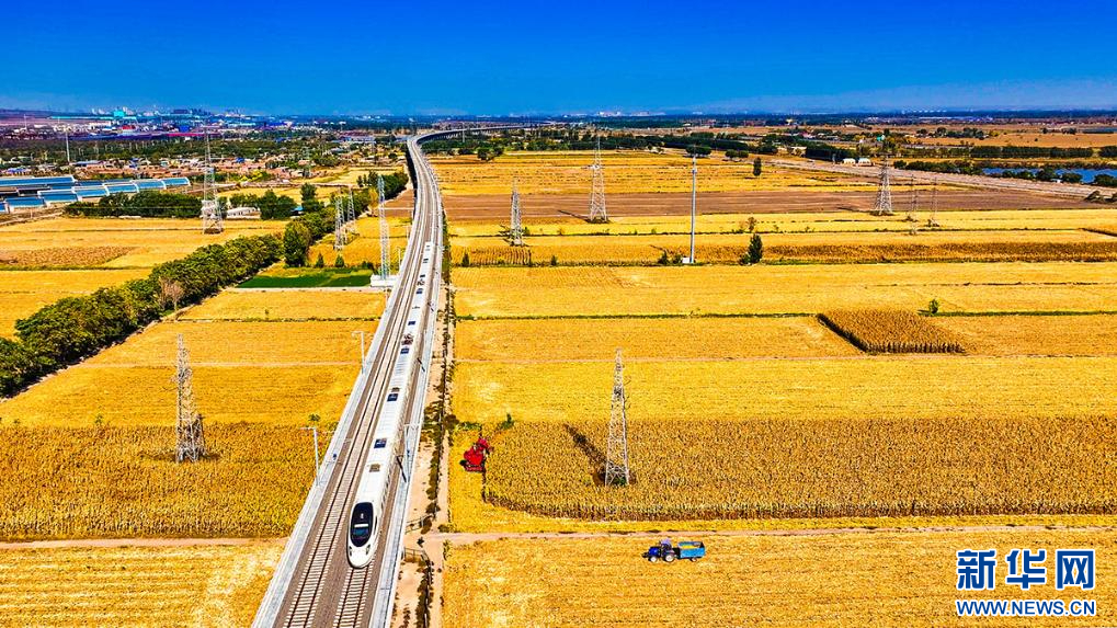 10月10日,一列动车组列车在金色田野间穿梭。新华网发 马智超 摄(无人机视频截图)pagebreak