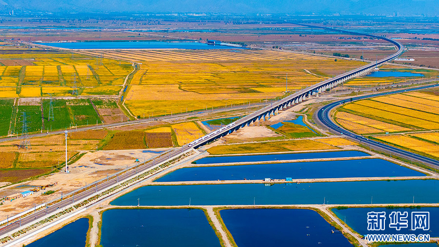 金秋时节,岁物丰成。包银高铁惠银段沿线色彩斑斓,钢铁巨龙穿越金色稻田,构成一幅壮丽的丰收图景。