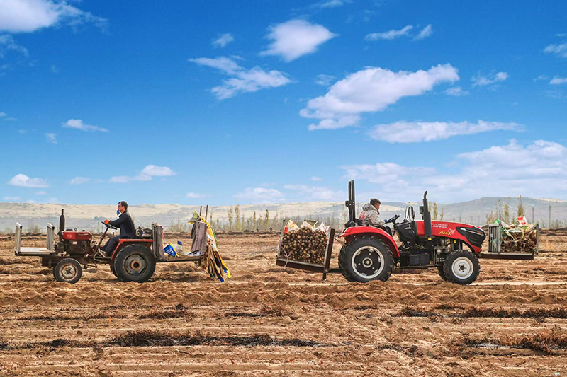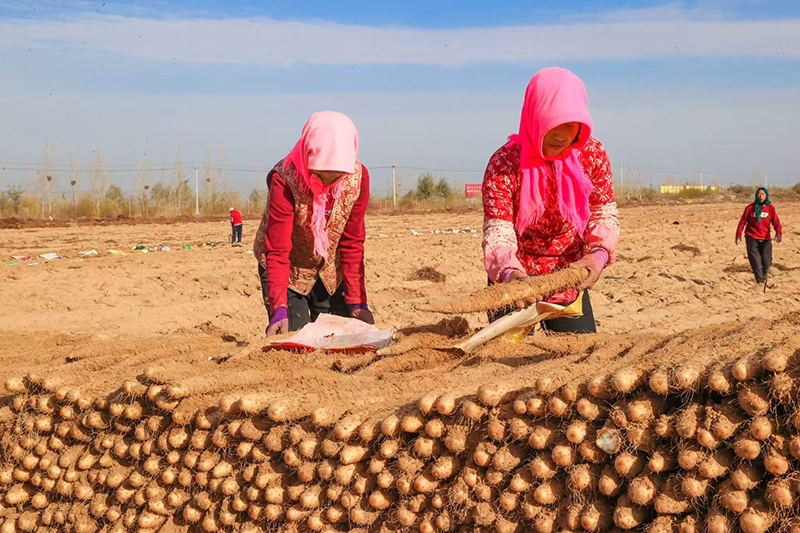 眼下,石嘴山市平罗县陶乐镇庙庙湖村种植的5434亩山药喜获丰收。伴随着开沟机隆隆的轰鸣声,农户们将根根裹着泥土的山药刨出来,整齐地码放在沟垄旁,等待着分拣、装车。