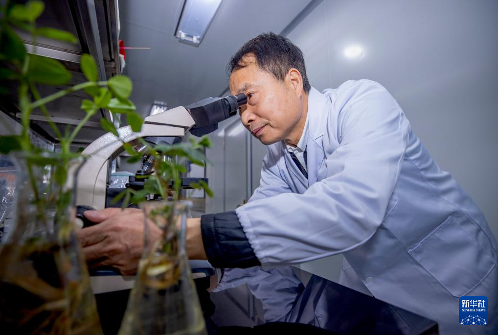 12月6日,杨国平在实验室通过显微镜查看抗盐碱微生物的实验情况。新华社记者 杨植森 摄