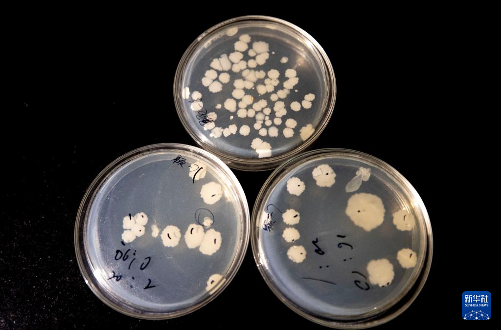 杨国平团队在抗盐碱微生物筛选实验中培养的微生物菌群器皿(12月6日摄)。新华社记者 杨植森 摄