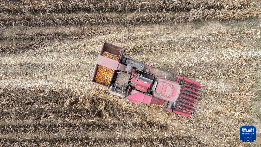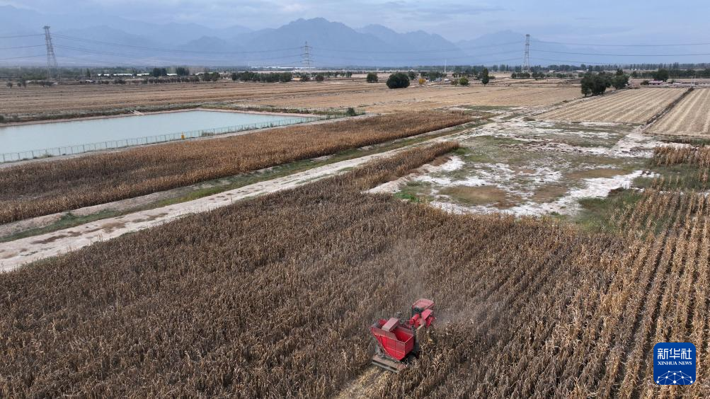 北方民族大学杨国平团队通过微生物方式治理过的盐碱地上种植的玉米已收获(10月12日摄,无人机照片)。新华社记者 杨植森 摄
