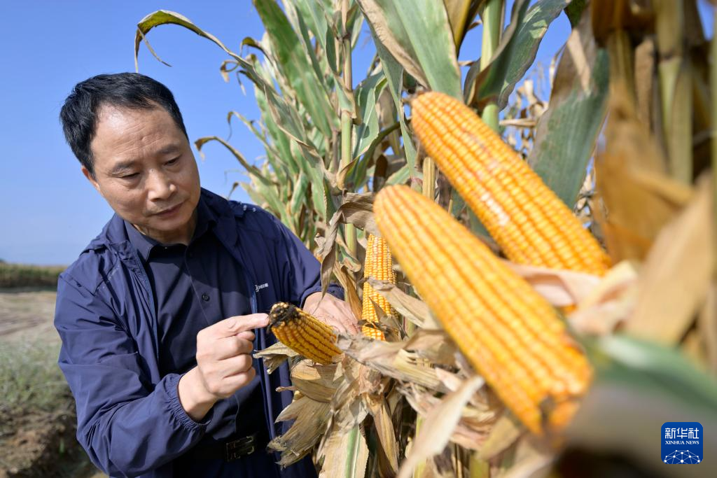 杨国平教授在与学生交流盐碱地种出的玉米生长情况(10月12日摄)。新华社记者 王鹏 摄