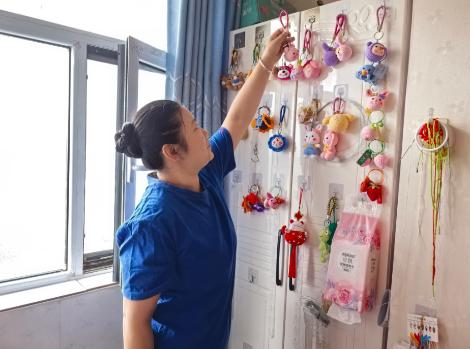 转机发生在女儿带来的一团毛线。当时社区征集手工制品,梁娟抱着试一试的心态拿起钩针,冰凉的金属触感意外让她平静下来。当第一个歪歪扭扭的小熊钥匙扣被邻居买走,握着带着体温的零钱时,她忽然感受到了生命的温度。