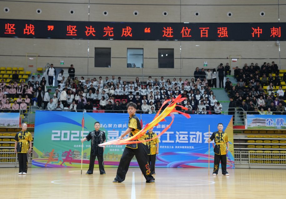 开幕式现场,67支参赛方队依次亮相,只见队员们精神抖擞、口号嘹亮,部分方队手持彩旗、展示标语,现场掌声、喝彩声不断,充分展现了灵武市广大职工团结奋进的良好精神风貌。开幕式还上演了精彩文艺表演,七星派武术表演展现中华武术魅力,灵武市职业技术学校学生带来的啦啦操表演活力四射,团体擒敌拳表演气势磅礴,赢得观众阵阵掌声。文艺表演结束后,运动会首场篮球比赛也正式开赛。两支参赛队的队员们迅速进入状态,在赛场上展开激烈角逐,传球、投篮等动作行云流水,现场观众为队员们的精彩表现呐喊助威,赛场氛围热烈。