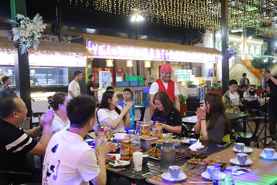 万达文旅小镇烤串的滋滋声、八宝茶的甜香,以及广场文艺演出、互动游戏,与游客的欢笑声共同奏响热烈交响曲;夜幕降临后,璀璨灯光秀更是吸睛无数。