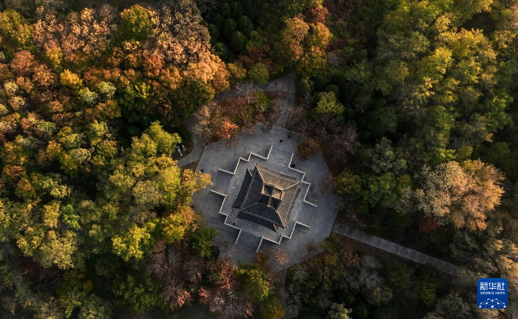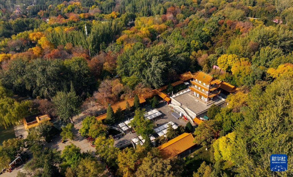 这是10月27日在银川市中山公园文昌阁拍摄的秋景(无人机照片)。