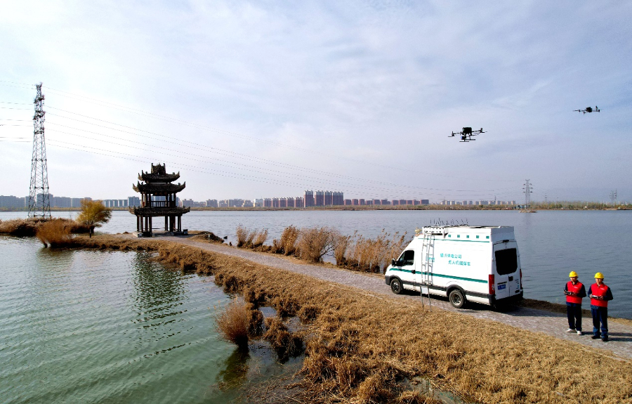11月12日,在宁夏回族自治区银川市金凤区,国网银川供电公司输电运检中心员工利用大疆M350及M4智能无人机设备对110千伏花安线进行线路巡视、红外监测,保障输电线路安全运行。袁宏彦 摄