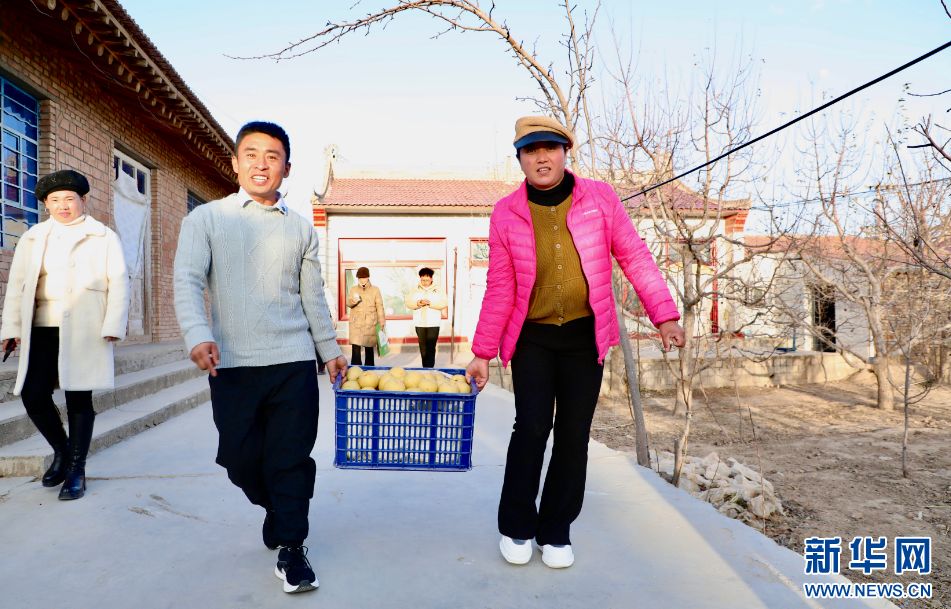 张学云(前排左)与妻子马小红(右)为购买香水梨的顾客送货。