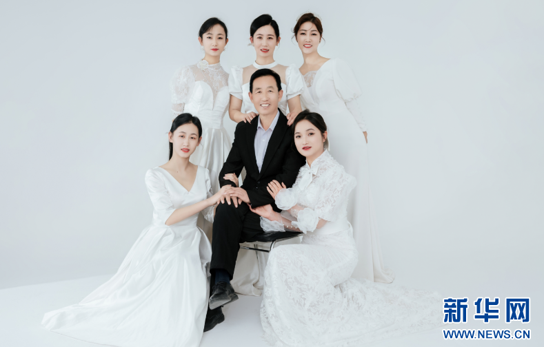 一身黑色西装坐在正中间,5个女儿着中式白色婚纱紧紧依偎在父亲身边,满满的幸福感从相框溢出,与采访对象马明杰洋溢出的笑脸叠印……