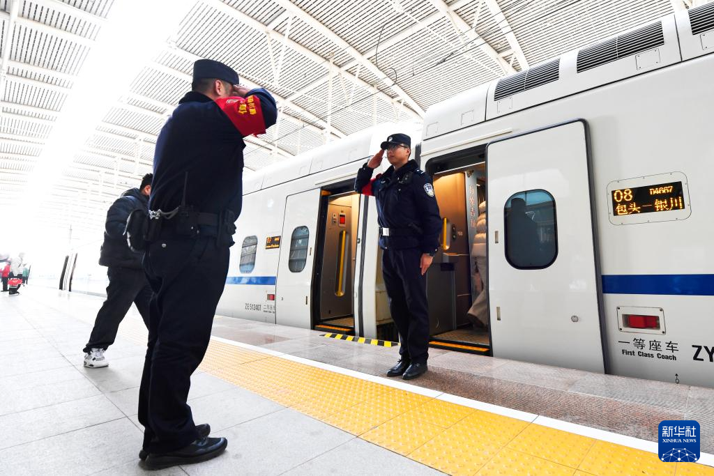 12月23日,在银川火车站,银川铁路公安处民警在包银高铁首发列车D4667次动车组前进行接车仪式。