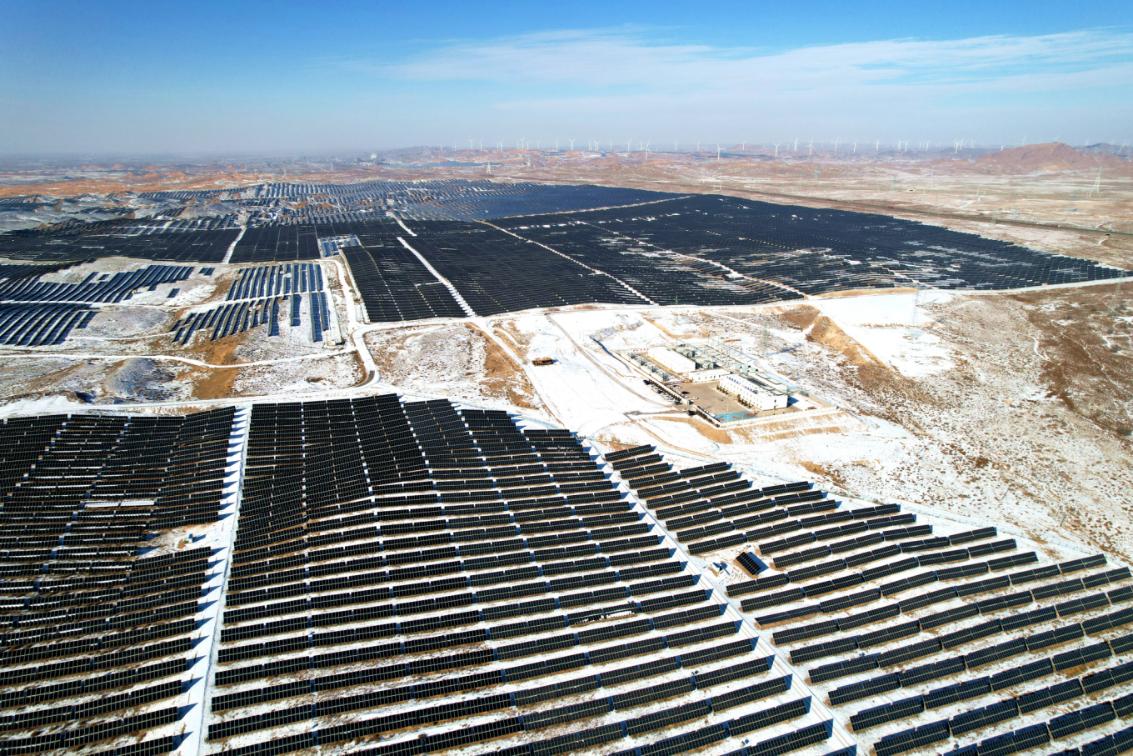 1月7日,在宁夏中卫市中宁县境内,一排排光伏太阳能发电板整齐排列在茫茫雪域戈壁滩上,源源不断输送绿色能源。(周序鹏 摄)