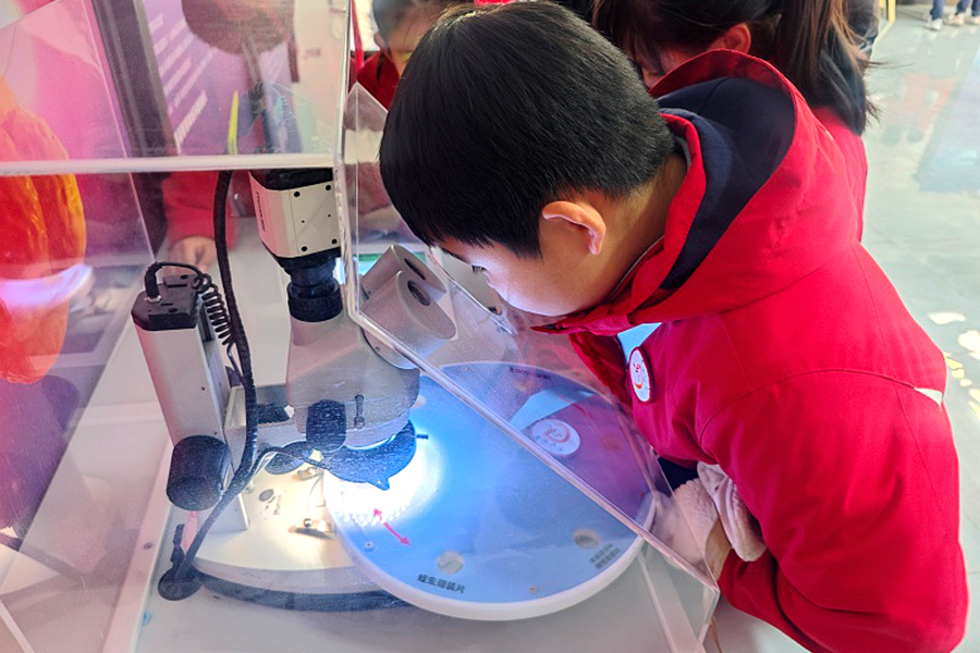 在大武口工业遗址公园流动科技馆内,孩子们在工作人员引导下,通过观察灯泡颜色变化判断温度、用高清显微镜探索昆虫细胞切片、协作探究小球在不同轨道的运动规律,在互动中直观领悟生物、物理、化学等学科知识。在科技馆,孩子们还亲手拼装我国现役武器装备模型,在实践中深化对国防科技的理解,脸上洋溢着自信与自豪。