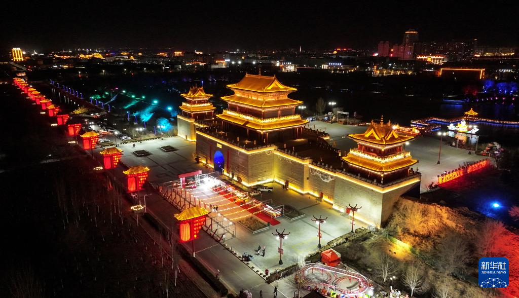 这是2月18日拍摄的宁夏盐池县九曲民俗文化园和长城关夜景(无人机照片)。