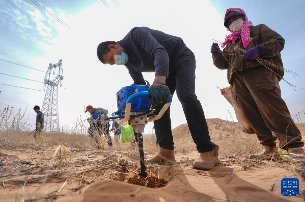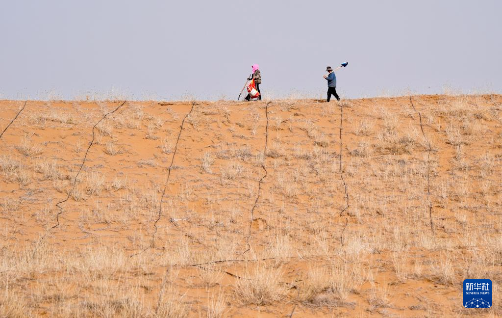 近日,随着天气转暖,宁夏中卫市组织治沙工人开展宁夏境内腾格里沙漠固沙锁边带补种补植工作,通过及时补种耐旱沙生植物,不断巩固治沙成果,筑牢黄河上游生态屏障。新华社记者 杨植森 摄